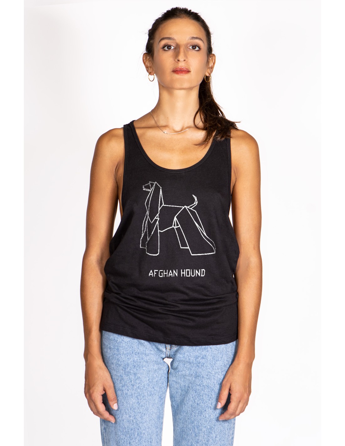 Discover the uniqueness of our Women Tank top , crafted for gym enthusiasts, with its generous cut and distinctive Origami Afghan hound graphic. The side cut elegantly reveals the chest, blending comfort and style in the gym.