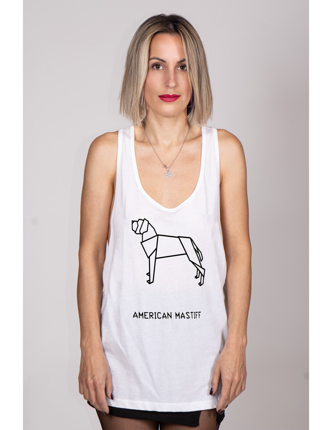 The associated dog breed is the American Mastiff, a majestic and gentle companion. If you identify your personality with strength, loyalty, and friendliness, then the Women's Origami American Mastiff tank top is the perfect choice for you. With our item, you can carry the essence of this extraordinary breed.